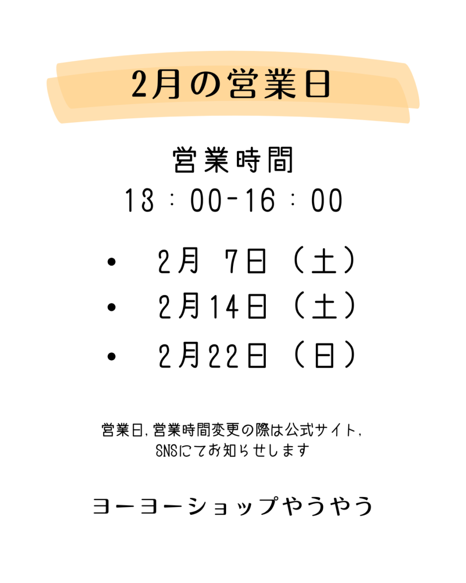 2026年2月の営業日のお知らせ 2026 1/31 ニュース 2026年1月31日 2026年2月の営業日 ヨーヨーショップやうやうです。2026年2月の店舗営業日を公開いたしました。 通常営業 2/ 7(土) 13:00–16:00 2/14(土) 13:00–16:00 2/22(日) 13:00–16:00 みなさまのご来店心よりお待ちしております。 お問い合わせ ニュース よかったらシェアしてね! URLをコピーしました! URLをコピーしました! 2026年1月の営業日のお知らせ 関連記事 2026年1月の営業日のお知らせ 2026年1月6日 2025年12月の営業日のお知らせ 2025年12月2日 2025年11月の営業日のお知らせ 2025年10月21日 【イベント出店】2025年10月26日(日)夢工房だいあん主催イベントに出店します 2025年10月5日 2025年10月の営業日のお知らせ 2025年9月25日 2025年9月10日放送 テレビ神奈川『猫のひたいほどワイド』にヨーヨーショップやうやうが紹介されます 2025年9月9日 2025年9月の営業日のお知らせ 2025年8月24日 2025年8月の営業日のお知らせ 2025年7月31日